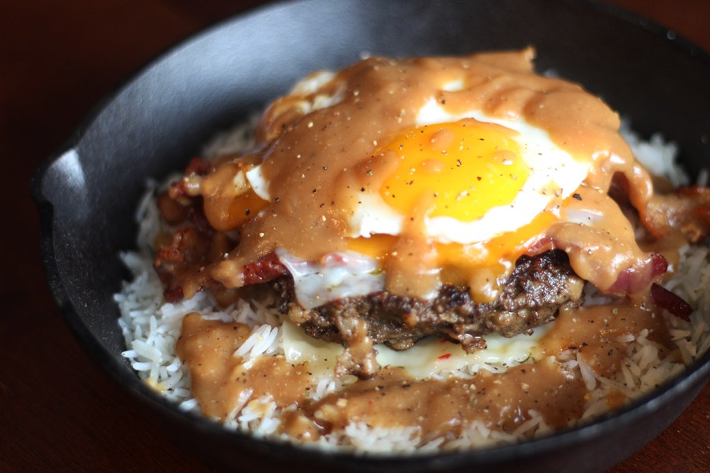 The art of leftovers comes fully around in this dish. Loco Moco is a Hawaiian dish that I absolutely love. It’s a simple dish of rice, hamburger patty, egg, and gravy. I spiced this one up with some extra cheese and bacon that I had lying around.